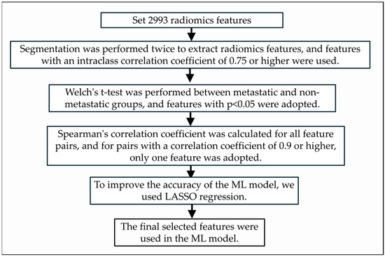 To evaluate the reproducibility of the feature values obtained from the segmented regions, we calculated the intraclass correlation coefficient (ICC) between the values obtained in the first and second segmentation. Only features with a value of 0.75 or higher, indicating a high correlation, were adopted. To assess the predictive utility of individual radiomics features for subsequent metastasis in early-stage oral squamous cell carcinoma, patients were divided into two groups: those who developed subsequent metastasis (metastasis group) and those who did not (non-metastasis group). Statistical significance between the two groups was evaluated for each radiomics feature. Assuming that the distribution of each feature was non-normal, Welch’s t-test was employed for the analysis. A p-value of less than 0.05 was considered statistically significant, indicating that the feature was potentially useful for predicting subsequent metastasis. Features showing significant differences were considered useful for predicting subsequent metastasis and were used to create the ML models. If multiple mutually correlated features are selected for ML model creation, the performance of the ML model may decrease; i.e., the features used in ML model creation need to be independent features with no redundancy. Therefore, the Spearman correlation coefficient was calculated between all pairs of features that showed a significant difference in the Welch’s t-test, and if a pair showed a value of 0.9 or higher, only one of the pairs was adopted. We used the least absolute shrinkage and selection operator (LASSO) regression model to eliminate excess features that could cause overfitting in the ML model, after which the final selected optimal features were used for ML model creation. Figure 3 shows the process of extracting radiomics features from the segmented regions and selecting them to build a machine learning model. The ML models used in this evaluation were logistic regression, support vector machine, random forest, naive Bayes, and k-nearest neighbor algorithms. LR is a regression analysis model that takes multiple features as input and calculates a function that outputs the probability of a true prediction of one of two or more discrete classes. SVM is a machine learning model that uses margin maximization and the kernel method to create a “classifier” that determines a boundary line or hyperplane that divides two classes of data based on training data. This model calculates separation using a hyperplane that maximizes the distance (margin) from the sample closest to the boundary. A kernel function is an algorithm used to increase dimensionality and separation by adding nonlinear features to data representation. RF is a machine learning model that creates many decision trees and predicts the classification of unknown data based on the majority vote of these trees. NB is a machine learning model that calculates the probabilities of all estimates given data and outputs the one with the highest probability as the estimation result. It is assumed that the data features are independent and uncorrelated with each other, and each feature independently affects the estimation results. KNN is a method of dividing data into groups by inferring which group the target data belongs to using a majority vote of the surrounding data.