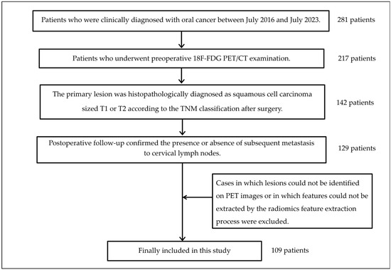 The flow diagram defining the steps of the tasks in this study is shown in Figure 1. The subject inclusion criteria were as follows: (1) clinical diagnosis of oral cancer at BLINDED between July 2016 and July 2023; (2) subjects underwent a preoperative 18F-FDG PET/computed tomography (CT) examination; (3) the primary lesion was histopathologically diagnosed as squamous cell carcinoma of size T1 or T2 according to the TNM classification after surgery; and (4) post-operative follow-up confirming the presence or absence of subsequent metastasis to cervical lymph nodes. Cases in which lesions could not be identified on PET images or in which features could not be extracted by the radiomics feature extraction process were excluded. The minimum follow-up period for detecting subsequent metastasis was set at within one year postoperatively. The diagnostic criterion for lymph node metastasis used to evaluate subsequent metastasis was defined as the presence of at least one metastatic lymph node identified by histopathological examination of lymph nodes following neck dissection.