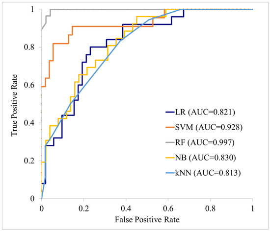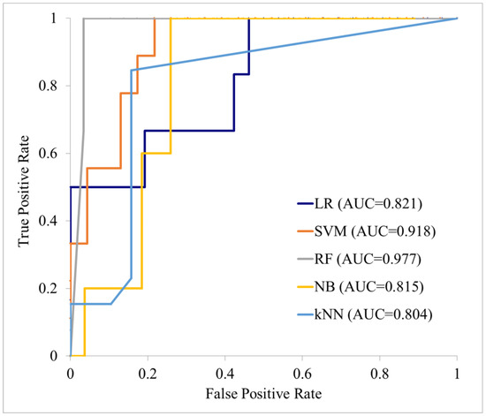 Performance of each machine learning model on the test data. LR: logistic regression; SVM: support vector machine; RF: random forest; NB: naive Bayes; KNN: k-nearest neighbor.