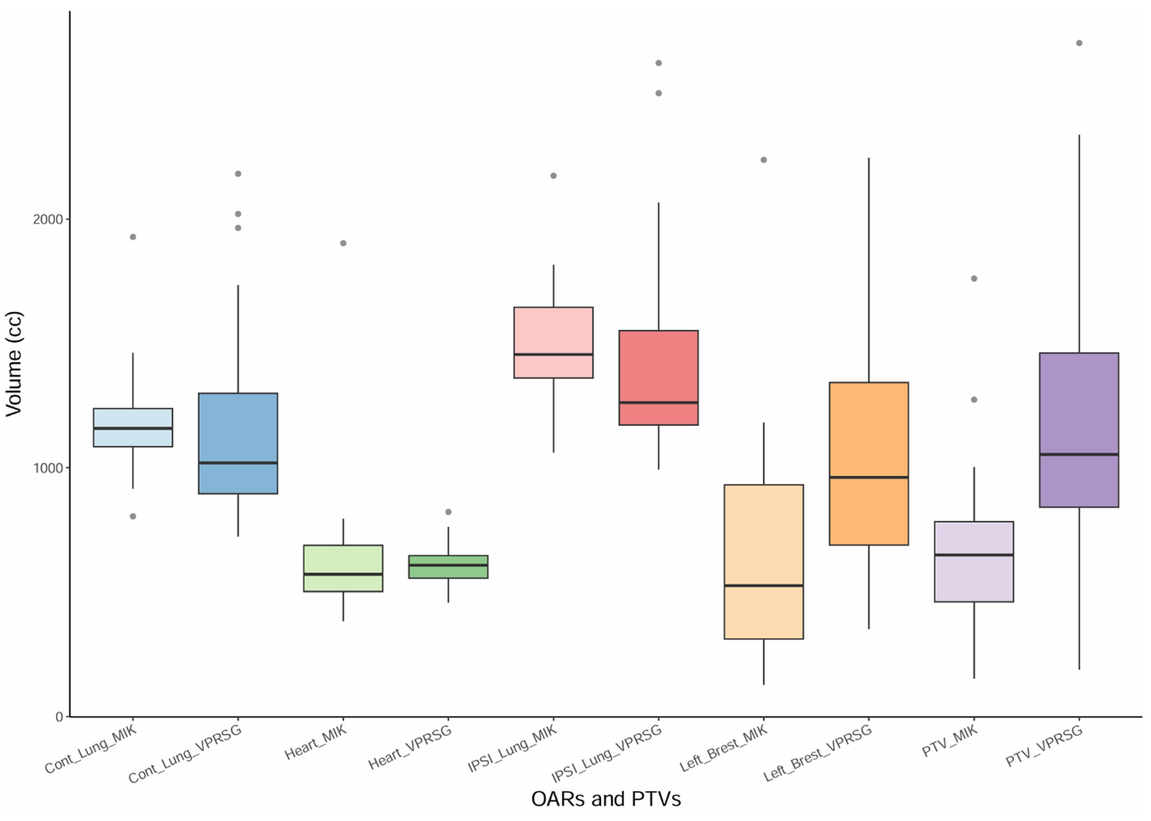 - Castriconi, R.; Tudda, A.; Placidi, L.; Benecchi, G.; Cagni, E.; Dusi, F.; Ianiro, A.; Landoni, V.; Malatesta, T.; Mazzilli, A.; et al. Inter-institutional variability of knowledge-based plan prediction of left whole breast irradiation. Physica Medica 2024, 120, 103331. [Google Scholar] [CrossRef] [PubMed]