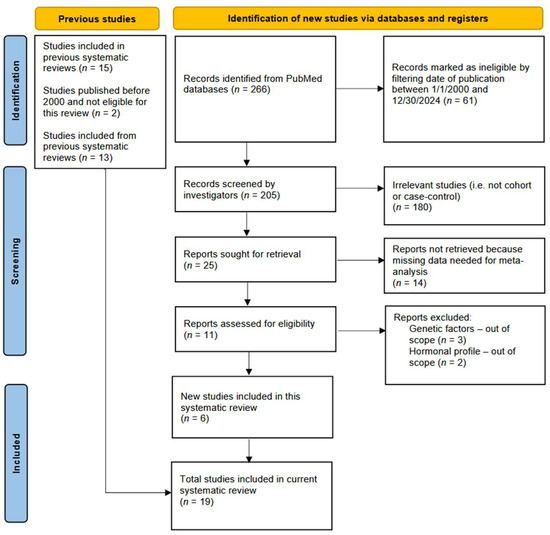A total of 266 records were identified from the PubMed and Cochrane Library databases, of which 241 were deemed ineligible based on screening and filtering criteria, as shown in the PRISMA flowchart Figure 1. Nineteen epidemiological studies [23,24,25,26,27,28,29,30,31,32,33,34,35,36,37,38,39,40,41] published between 1 January 2000 and 31 December 2024 were included in this updated meta-analysis, of which six were newly published articles not included in prior meta-analyses [15,16]. The characteristics of all studies are presented in Table 1, along with a summary of sample size, definition of aggressive PrCa (when available), and the assessment of study quality. Overall, there were seven prospective cohort studies [23,30,34,35,37,38,40] and twelve case–control studies included, with a total sample size of 17,810 PrCa cases and 146,806 controls/non-cases. Most studies were carried out in Europe, the US, and Canada, but three epidemiologic studies were conducted in Australia. On average, men enrolled in these studies were 65 years or older and the majority were Caucasian, with only one study investigating MPB and PrCa among African American men in the US [32]. The definition of aggressive PrCa varied across the studies, with most of them using a Gleason score of 7 to 10 to define more aggressive cancer, but others used either Gleason score 8 to 10, or regional, or distant/metastatic tumor stage, or a serum PSA > 20 ng/mL (Table 1). As anticipated, case–control studies were more likely to be affected by both selection and recall bias and the quality of studies ranged from fair to very good.