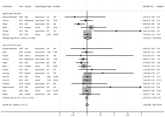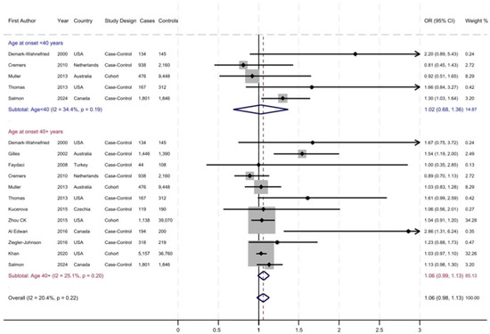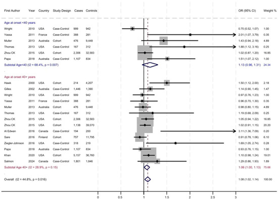 The prevalence of MPB increased from 5% to 65% with aging and varied across the studies. Figure 2, Figure 3 and Figure 4 display the forest plots of studies that investigated the associations of patterns of hair loss: frontal-only, vertex-only, or both frontal and vertex MPB, as well as ages at MPB onset with risk of total PrCa, respectively. Overall, there was no association between frontal MPB and PrCa risk (Figure 2 and Table 2). Vertex MPB was associated with a 6% increased risk of total PrCa in men aged 40 years or older (pooled RR = 1.06; 95% CI 0.98–1.13), although results were borderline statistically significant (Figure 3). Among men with vertex pattern hair loss at younger ages there was no elevated risk of PrCa. Both frontal and vertex MPB were associated with a pooled RR of 1.08 (95% CI 1.02–1.14) for total PrCa (Figure 4 and Table 2), but this association was driven mostly by studies with MPB onset at ages 40 years or older. Younger-onset (<40 years) frontal and vertex MPB was also associated with a pooled RR = 1.13 (95% CI 0.96–1.31) of total PrCa, although results were not statistically significant (Figure 4 and Table 2). However, there were only six studies that had available data for this analysis. Notably, there was substantial heterogeneity across the studies with I2 values ranging from 20.4% to 70.9% for various meta-analyses, and in some analyses this heterogeneity was statistically significant (Table 2).