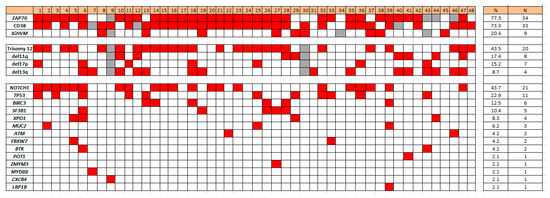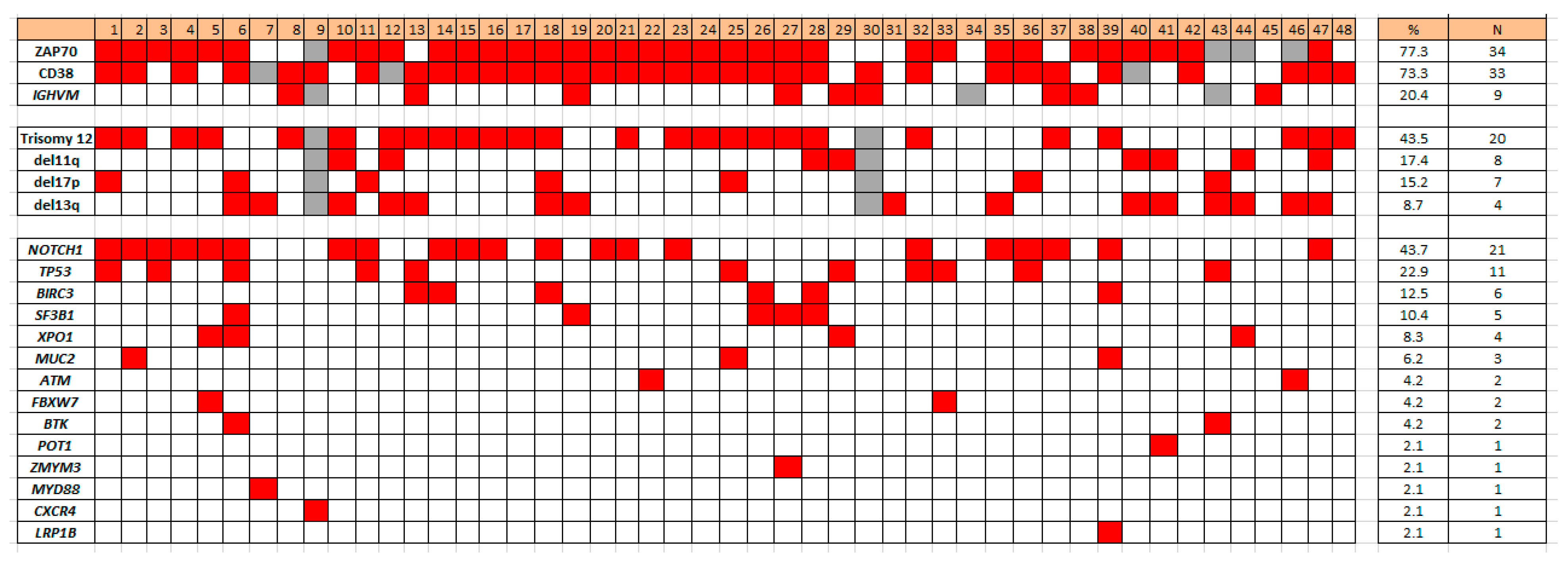 - Hu, B.; Patel, K.P.; Chen, H.C.; Wang, X.; Luthra, R.; Routbort, M.J.; Kanagal-Shamanna, R.; Medeiros, L.J.; Yin, C.C.; Zuo, Z.; et al. Association of gene mutations with time-to-first treatment in 384 treatment-naive chronic lymphocytic leukaemia patients. Br. J. Haematol. 2019, 187, 307–318. [Google Scholar] [CrossRef]