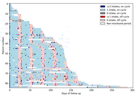 Figure 1 presents the data collected daily for each of the 85 patients. The alternance of on and off cycles is visible in this Figure as the alternance of blue and red areas. Missed doses during on cycles correspond to gray cells, while doses taken during off cycles correspond to bright red cells.