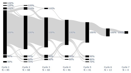 Median overall LEN implementation adherence was 100% [IQR: 98–100%; range: 50–113%]. Median LEN implementation adherence per cycle was 100% [IQR: 100–100%; range: 50%, 130%]. Figure 2 shows the proportion of doses taken for each patient during each monitored on cycle. All doses were taken by 43 patients (51%). One missed dose occurred in 18 (21%) patients, two in 9 (11%), three in 7 (8%), and 8 (9%) had ≥4 missed doses, at any stage. Two or more consecutive doses were missed once in 8 patients (9%) and twice in 2 (2%).