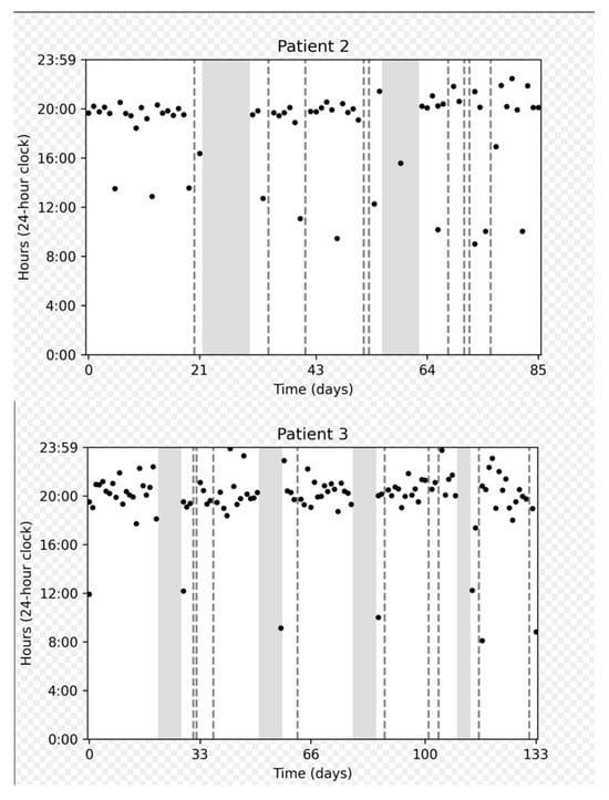 Chronological plots representing individual data from three patients. The horizontal axis displays the intake date. The vertical axis gives the time on a 24 h clock from 0:00 to 23:59. Each dot represents one medication intake. The vertical dashed gray lines represent days with no intake. Gray areas represent “off” periods, and white areas represent “on” periods.