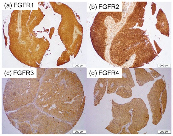 IHC was performed on the sections (4 µm thick) from the bladder TMA. Slides were deparaffinized using xylene, rehydrated with graded ethanol, and subjected to heat-induced antigen retrieval by microwaving (2 min at high power, followed by 30 min at mid-low power) (Target Retrieval Solution pH9; Dako, Carpinteria, CA, USA). After blocking with 3% hydrogen peroxidase, samples were incubated overnight at 4 °C with a primary antibody against FGFR1 (clone 10F12E7, dilution 1:50; Proteintech, Rosemont, IL, USA), FGFR2 (clone 1G3, 5 μg/mL; Abnova, Taipei, Taiwan), FGFR3 (clone B-9, 1:50; Santa Cruz Biotechnology, Dallas, TX, USA), or FGFR4 (clone A-10, 1:50; Santa Cruz Biotechnology). The slides were then treated with a broad-spectrum secondary antibody (Histostain-SP Broad Spectrum Kit; Invitrogen, Grand Island, NY, USA) and washed with Envision FLEX Wash Buffer (Dako). After 3,3′-diaminobenzidine staining, the slides were counter-stained with hematoxylin, dehydrated with gradient ethanol and xylene, and then sealed. All slides were reviewed by a single pathologist (HM), who was blinded to the sample identities. The original pathology data, including the IHC slides and results, was obtained from USBioMAX. The German immunoreactive score was determined by multiplying the percentage of immunoreactive cells (0% = 0; 1–10% = 1; 11–50% = 2; 51–80% = 3; and 81–100% = 4) by the staining intensity (negative = 0; weak = 1; moderate = 2; and strong = 3). Immunohistochemical scores, ranging from 0 to 12, were classified as negative (0; 0–1), weakly positive (1+; 2–4), moderately positive (2+; 6–8), or strongly positive (3+; 9–12) for FGFR expression. By accounting for both the number of expressing cells (quantitative aspect) and the level of protein expression within them (qualitative aspect), the score provides a more biologically relevant and sensitive metric [D:9713356] [].