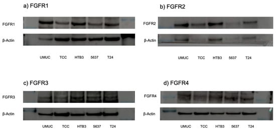 Expression of FGFR proteins in bladder cancer cell lines. Western blotting of FGFR1 ((a); 91 kDa), FGFR2 ((b); 37 kDa), FGFR3 ((c); 125–135 kDa), and FGFR4 ((d); 95–125 kDa) in UMUC3, TCC-sup, HTB3, 5637, and T24 cells. β-Actin (45 kDa) served as an internal control. The uncropped blots are shown in Figure S1 in Supplementary Materials.