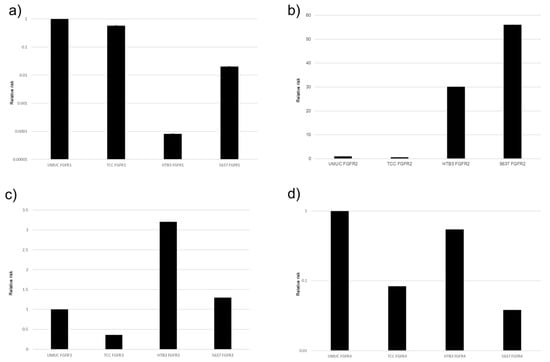The protein and gene expression of FGFR1-FGFR4 were examined in five bladder urothelial cancer cell lines, using Western blotting (Figure 2) and real-time qPCRs (Figure 3), respectively. All these cell lines were confirmed to express FGFR1–FGFR4.