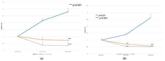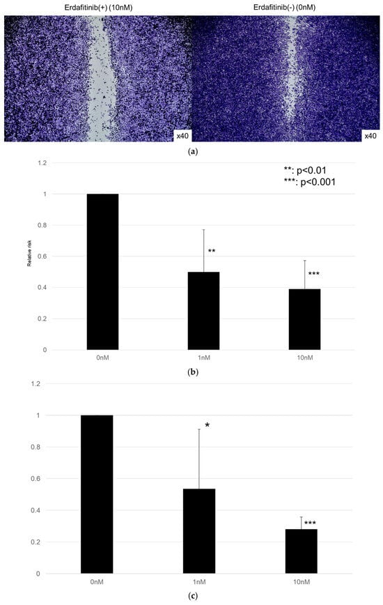 The effects of erdafitinib on the cell growth were analyzed via an MTT assay (Figure 4), wound healing assay (Figure 5), and transwell invasion assay (Figure 6). In the MTT assay, erdafitinib significantly reduced the cell proliferation of UMUC3 (Figure 4a) and 5637 (Figure 4b) in a dose-dependent manner. In the wound healing assay, erdafitinib at 1 or 10 nM significantly inhibited the migration of UMUC3 (Figure 5a,b) and 5637 (Figure 5c) cells. Similarly, in the transwell invasion assay, erdafitinib at 1 or 10 nM significantly inhibited the invasion of UMUC3 (Figure 6a,b) and 5637 (Figure 6c) cells.