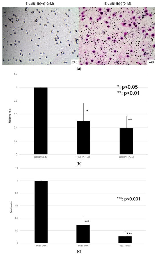 Effects of erdafitinib on cell invasion in bladder cancer cell lines. UMUC3 (a,b) and 5637 (c) cells were cultured in Matrigel-coated transwell chambers in the presence of 0–10 nM erdafitinib for 48 h, and the number of infiltrating cells in the lower chambers was counted in five random fields under a light microscope (10× objective). Each value relative to the number of mock-treated cells represents the mean (+SD) from three independent experiments. * p < 0.05; ** p < 0.01; and *** p < 0.001 (vs. mock treatment).