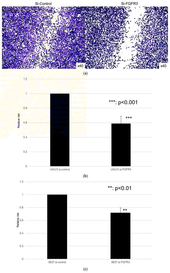 Effect of FGFR3 silencing on the migration of bladder cancer cell lines. UMUC3 (a,b) and 5637 (c) cells expressing control-siRNA or FGFR3-siRNA grown to confluence on 6-well tissue culture plates were gently scraped, and the wound closure area was measured after 24 h. Each value relative to the migration of control cells represents the mean (+SD) from three or more independent experiments. ** p < 0.01, *** p < 0.001 (vs. control-siRNA).