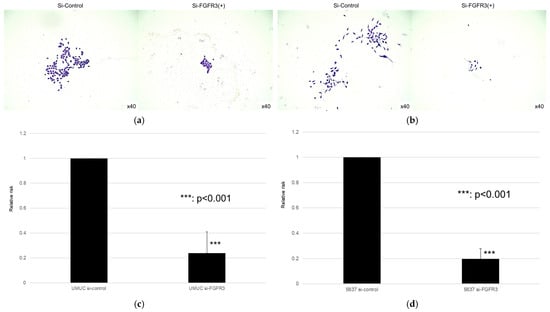 Effect of FGFR3 silencing on the colony formation in bladder cancer cell lines. UMUC3 (a,b) and 5637 (c,d) cells expressing control-siRNA or FGFR3-siRNA were cultured, and the number of the colonies was counted. Each value relative to the number of control colonies represents the mean (+SD) from at least three independent experiments. *** p < 0.001 (vs. control-siRNA).