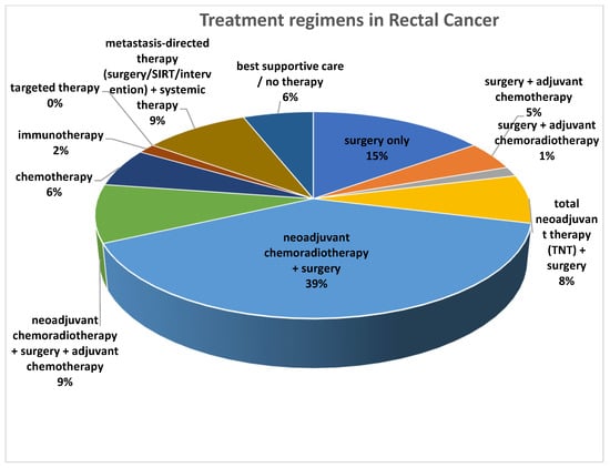 Among the 66 rectal cancer therapies recorded, the most frequent approach was neoadjuvant chemoradiotherapy followed by surgery (n = 26). Surgery alone (n = 10) or combined with chemotherapy (n = 3) was also common, while immunotherapy and targeted therapy were rarely used. A small number of patients received only supportive care or no therapy, as displayed in Figure 3.