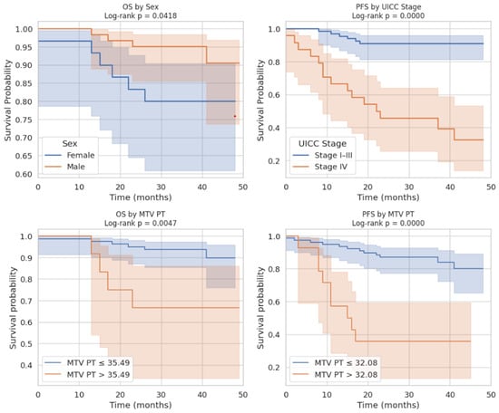 The Kaplan–Meier survival analyses illustrated these associations. For OS, patients with MTV values below the optimal cut-off of 35.49 had significantly better survival outcomes. In addition, male patients demonstrated a tendency toward longer survival compared to females. For PFS, patients above the MTV cut-off of 32.08 had a significantly shorter time to progression as captured in Figure 6. Finally, stratification by UICC stage showed that patients with stage IV colorectal cancer had the poorest PFS, confirming the results of the Cox regression.