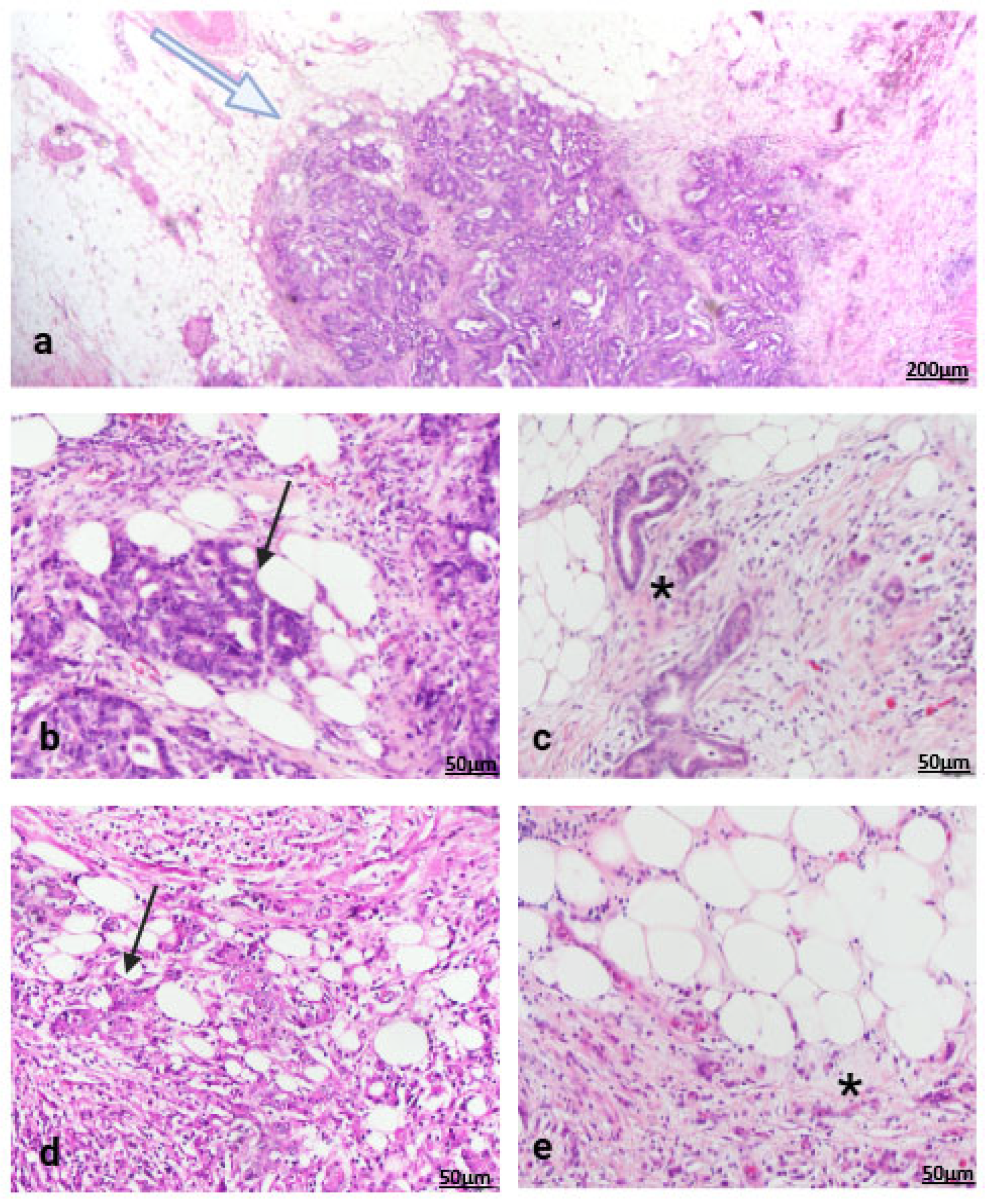- Grosser, B.; Heyer, C.M.; Austgen, J.; Sipos, E.; Reitsam, N.G.; Hauser, A.; VanSchoiack, A.; Kroeppler, D.; Vlasenko, D.; Probst, A.; et al. Stroma AReactive Invasion Front Areas (SARIFA) proves prognostic relevance in gastric carcinoma and is based on a tumor–adipocyte interaction indicating an altered immune response. Gastric Cancer 2024, 27, 72–85. [Google Scholar] [CrossRef] [PubMed]