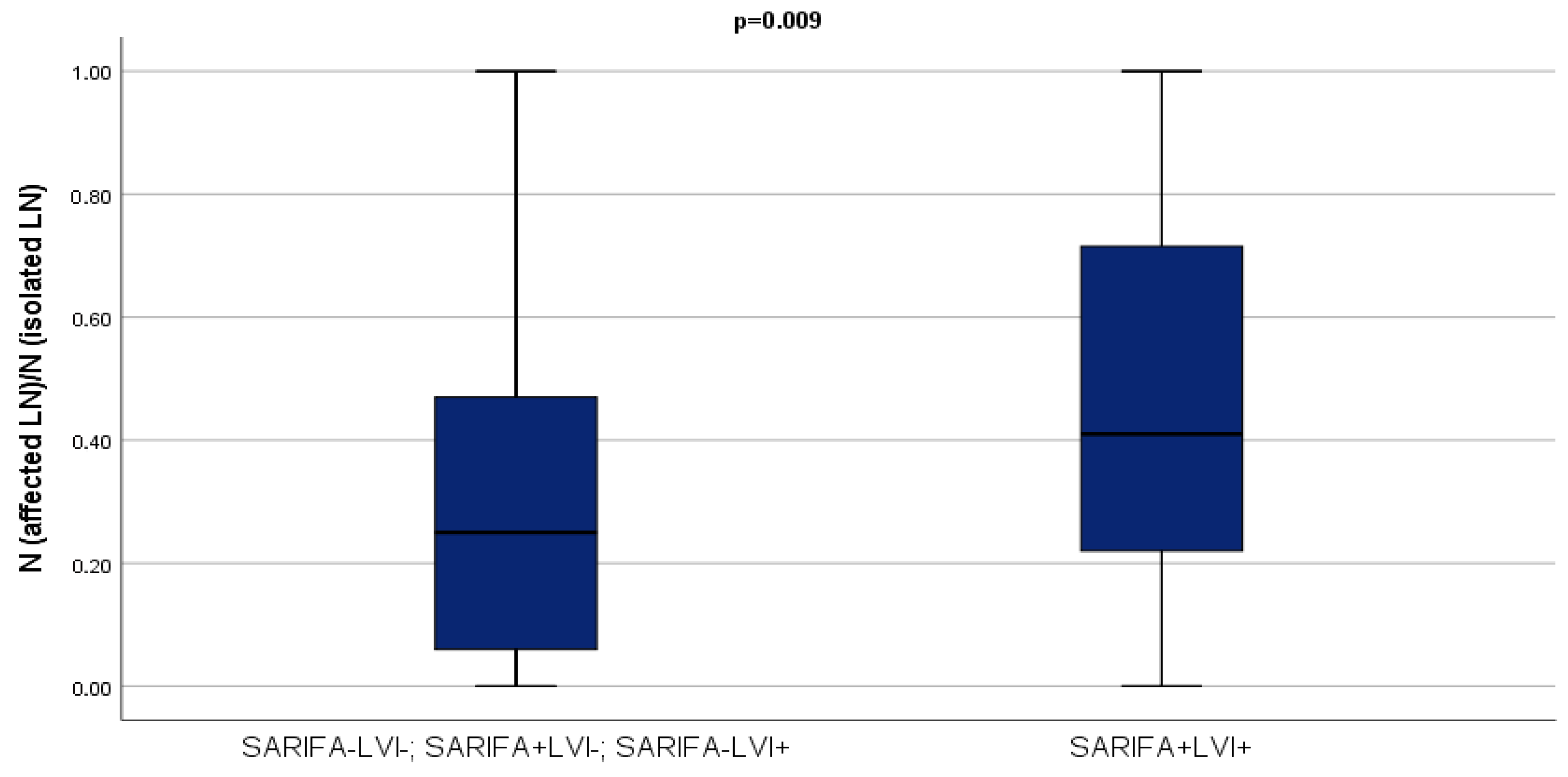 | Proportion of positive lymph nodes (median, IQR) | 0.28 (0.09–0.66) | 0.33 (0.17–0.7) | 0.27 (0.07–0.52) | 0.083 * |