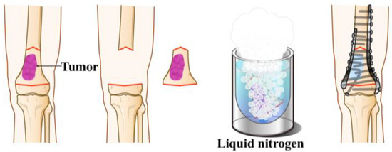 - Tsuchiya, H.; Wan, S.L.; Sakayama, K.; Yamamoto, N.; Nishida, H.; Tomita, K. Reconstruction using an autograft containing tumour treated by liquid nitrogen. J. Bone Jt. Surg. Br. 2005, 87, 218–225. [Google Scholar] [CrossRef]
