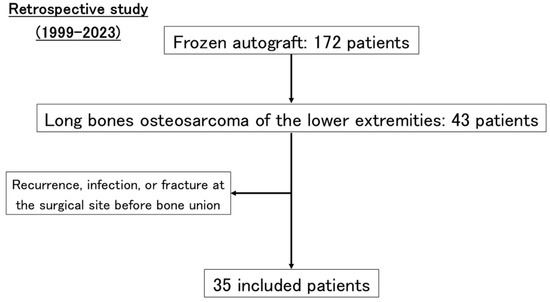 - Takeuchi, A.; Tsuchiya, H.; Setsu, N.; Gokita, T.; Tome, Y.; Asano, N.; Minami, Y.; Kawashima, H.; Fukushima, S.; Takenaka, S.; et al. What are the complications, function, and survival of tumor-devitalized autografts used in patients with limb-sparing surgery for bone and soft tissue tumors? A Japanese musculoskeletal oncology group multi-institutional study. Clin. Orthop. Relat. Res. 2023, 481, 2110–2124. [Google Scholar] [CrossRef] [PubMed]