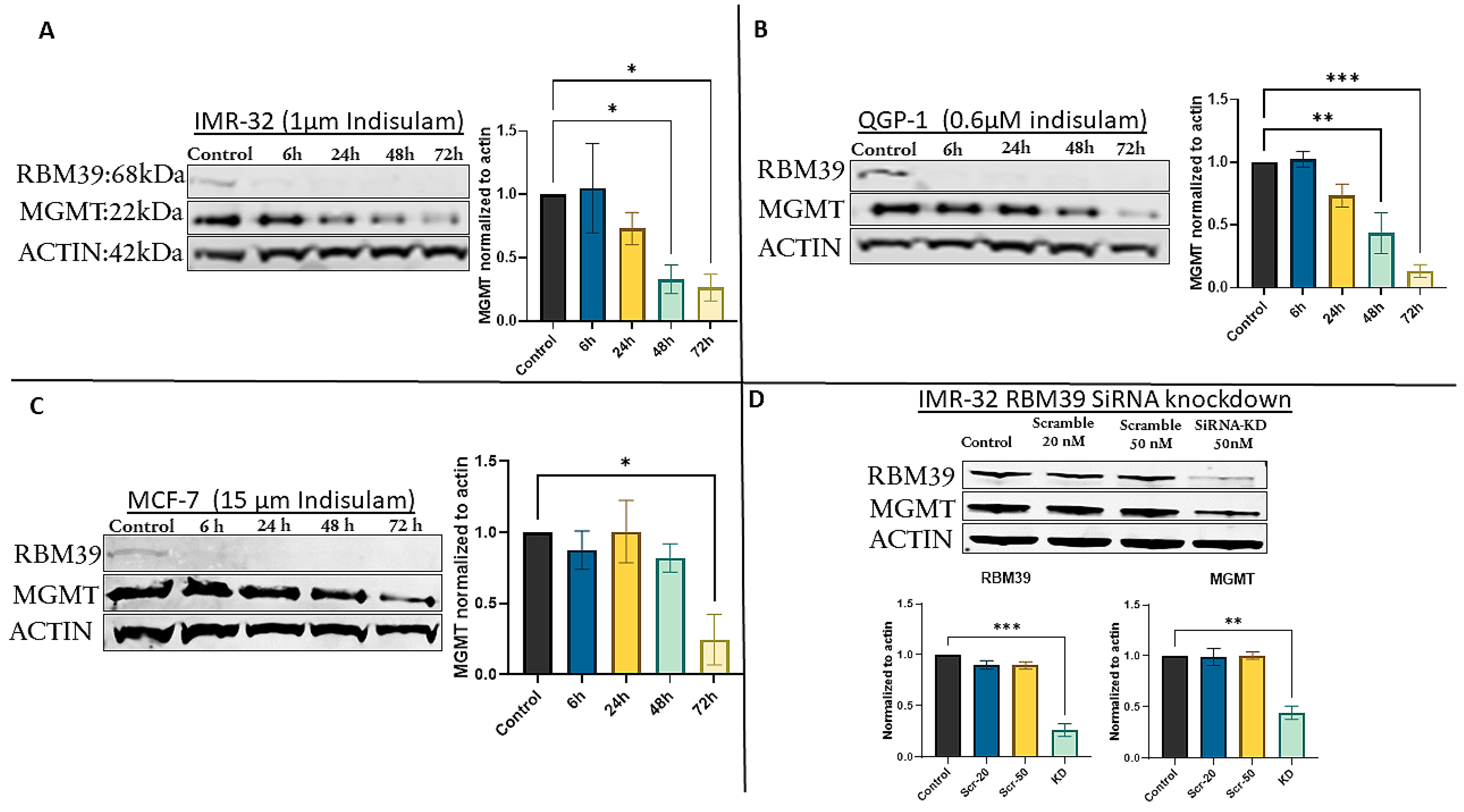Figure 1. Indisulam treatment induces RBM39 degradation and downregulation of MGMT in multiple cancer cell lines. (A) IMR-32, (B) QGP-1, and (C) MCF-7 cells were treated with indisulam for the indicated times. (D) RBM39 siRNA knockdown in IMR-32 cells recapitulates MGMT suppression. β-actin was used as a loading control. Bar graphs represent densitometric quantification of RBM39 and MGMT band intensities normalized to β-actin and expressed relative to the control condition (mean ± SD, n = 3). Statistical significance was determined by one-way ANOVA; p < 0.05 (*), p < 0.005 (**), p < 0.0005 (***). The uncropped blots are shown in Figure S1 and Table S1.