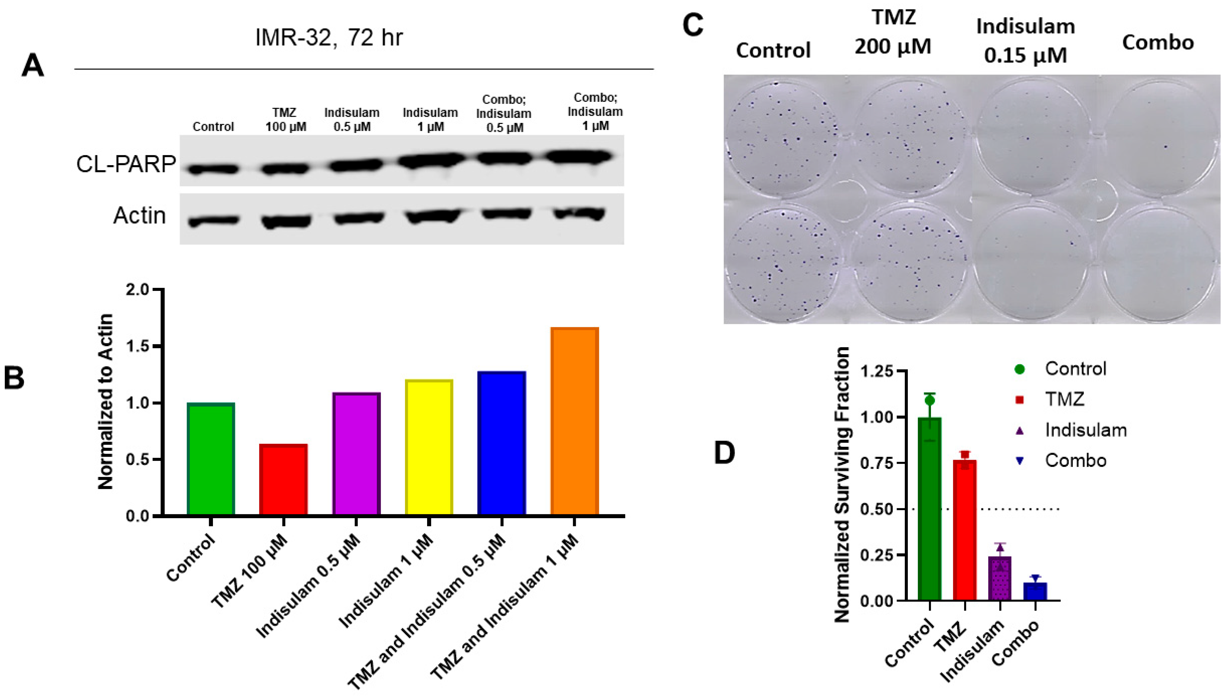 Figure 3. Indisulam enhances TMZ-induced apoptosis and reduces clonogenic survival. (A) Western blot analysis of IMR-32 cells treated with TMZ (100 μM), indisulam (0.5 or 1 μM), or combinations for 72 h. Cleaved PARP (CL-PARP) was used as a marker of apoptosis; β-actin was used as a loading control. (B) Quantification of CL-PARP expression normalized to actin. (C) Clonogenic assay of QGP-1 cells treated with control, TMZ (200 μM), indisulam (0.15 μM), or combination for 72 h, followed by growth in drug-free media for 14 d. (D) Colonies (>50 cells/colony) were stained with 0.5% crystal violet, counted, and normalized to the control to calculate the surviving fraction. The uncropped blots are shown in Figure S3 and Table S1.