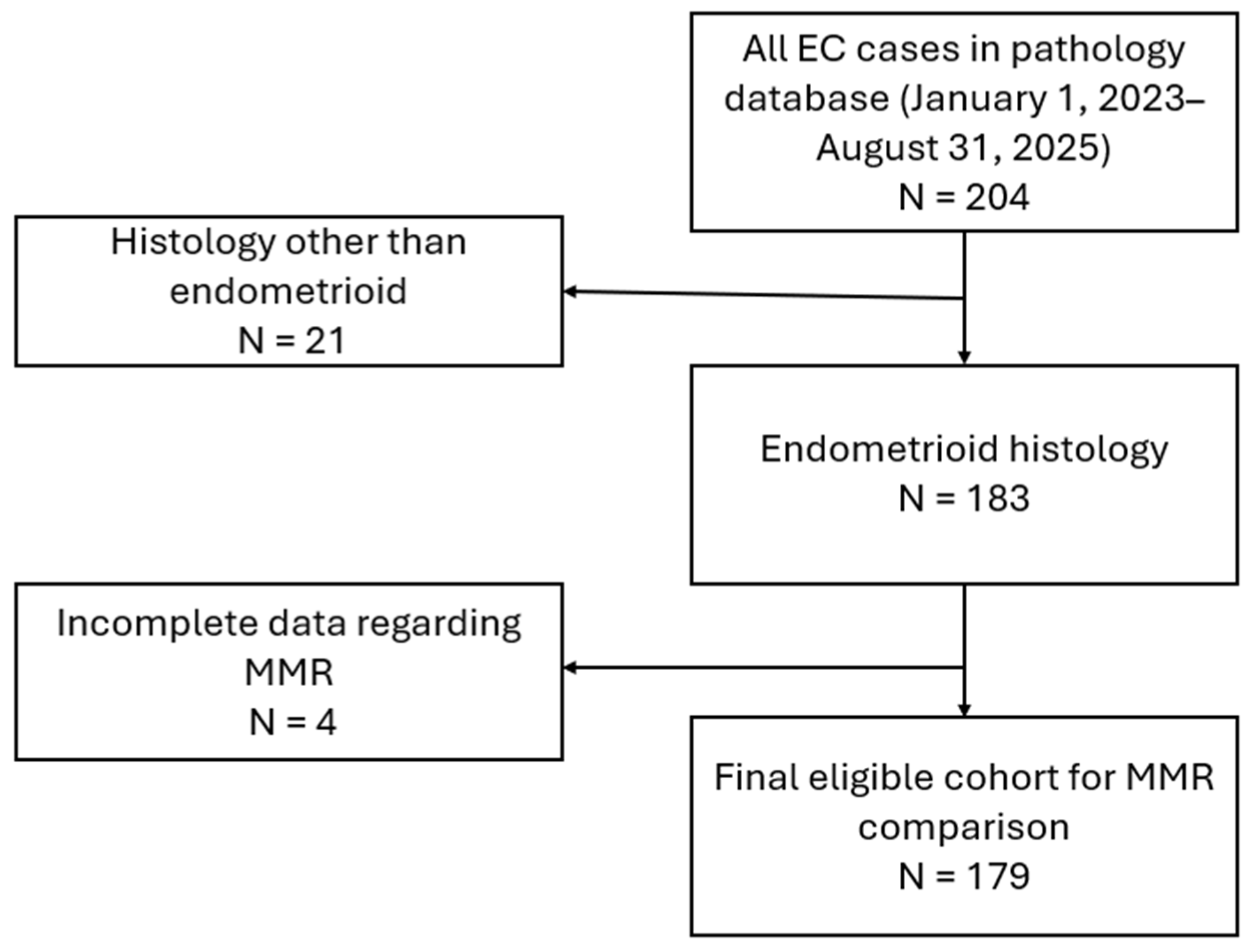 - Saharti, S.; Altaf, F. Mismatch Repair Proteins Evaluation in Endometrial Carcinoma: Clinicopathological Features and Prognostic Implications. Available online: https://www.ejgo.net/articles/10.22514/ejgo.2024.076?utm_source=chatgpt.com (accessed on 8 September 2025).