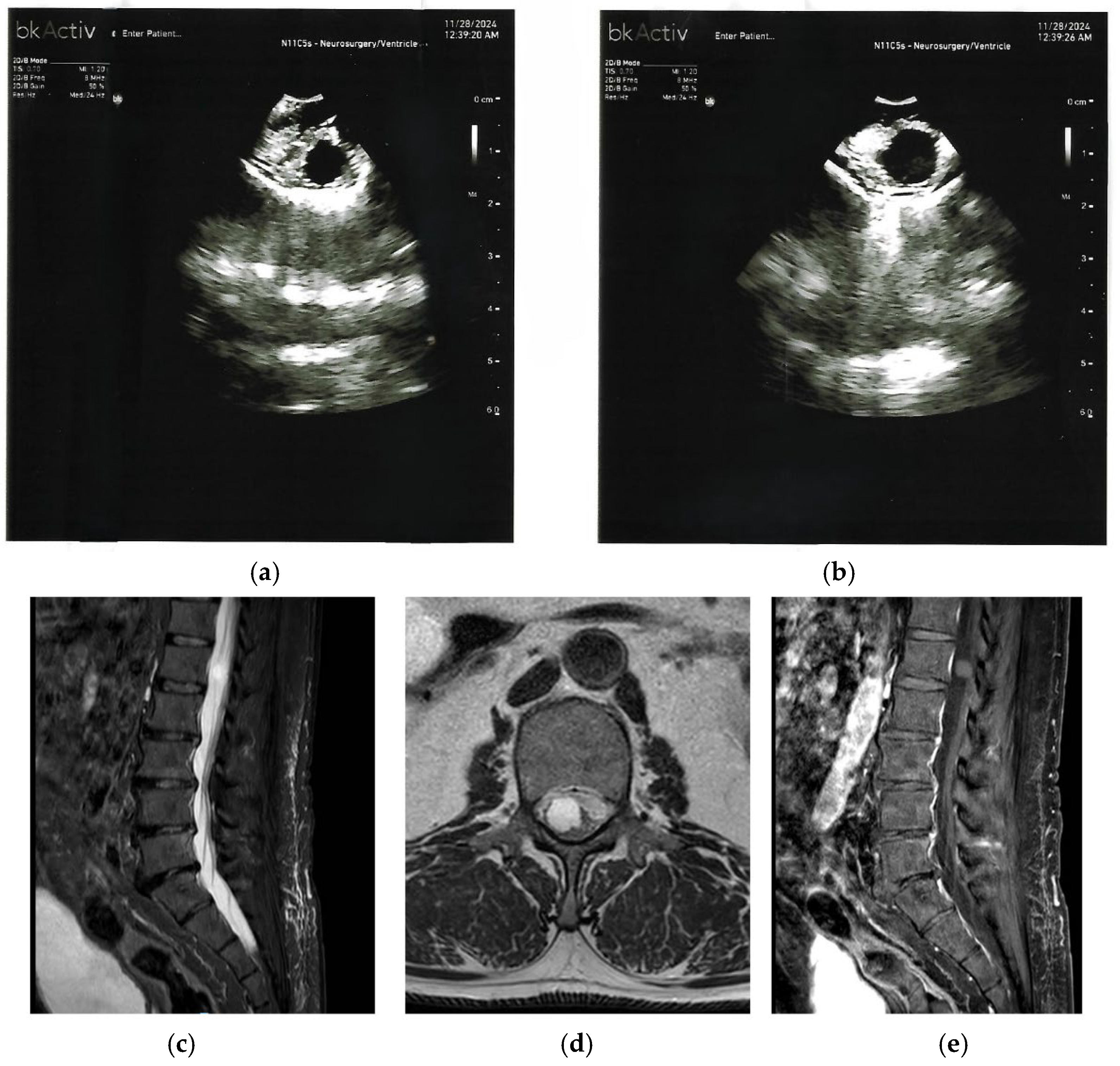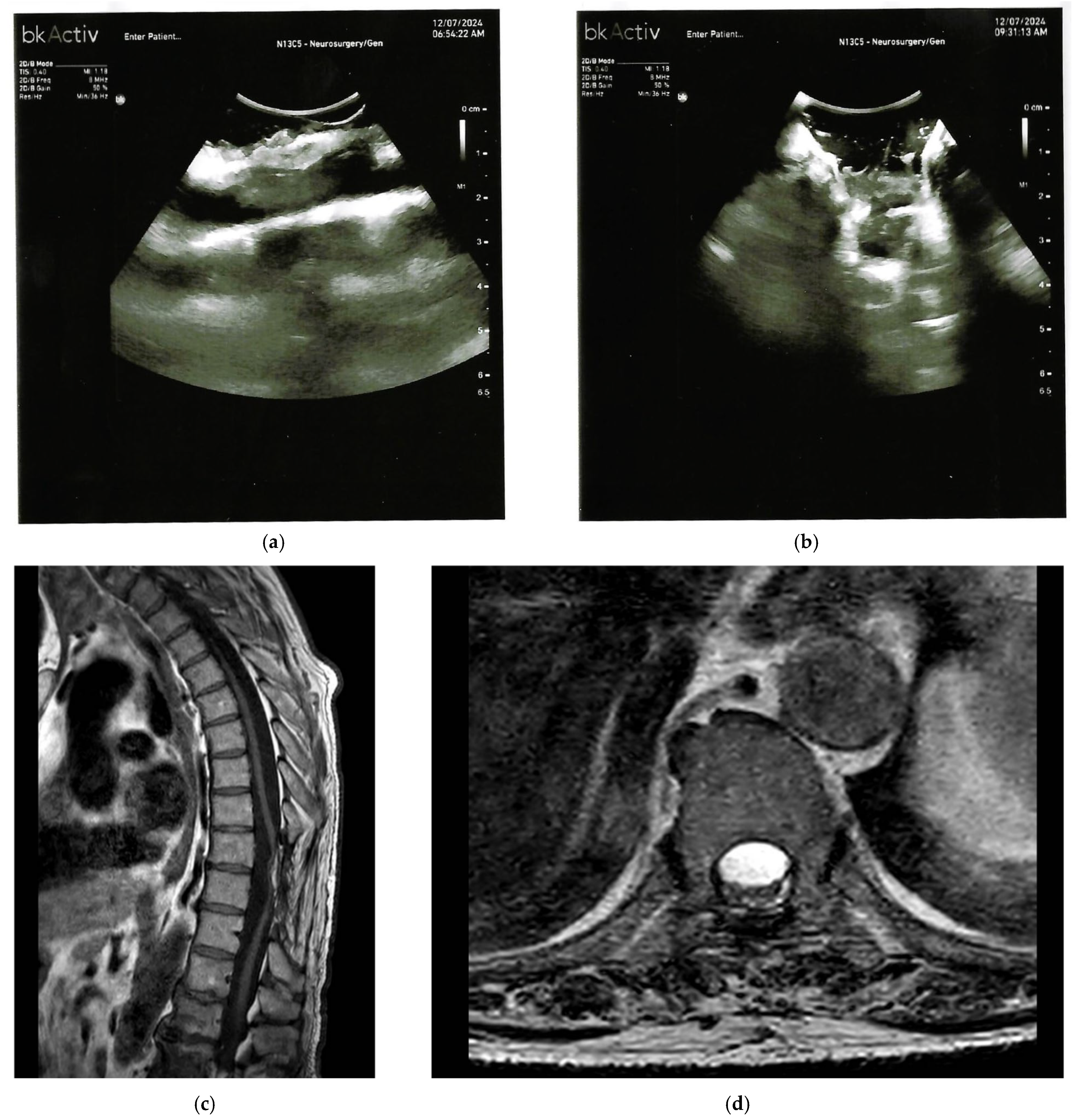 | Spinal Chronic Subdural Hematoma (CSSDH) | Hyperintense on T1 or T2 (late subacute); isointense or hypointense (chronic); elongated dorsal collection with cord displacement. | Hypoechoic or anechoic subdural collection beneath echogenic dura; internal echoes or septations; bounded by echogenic membrane. |