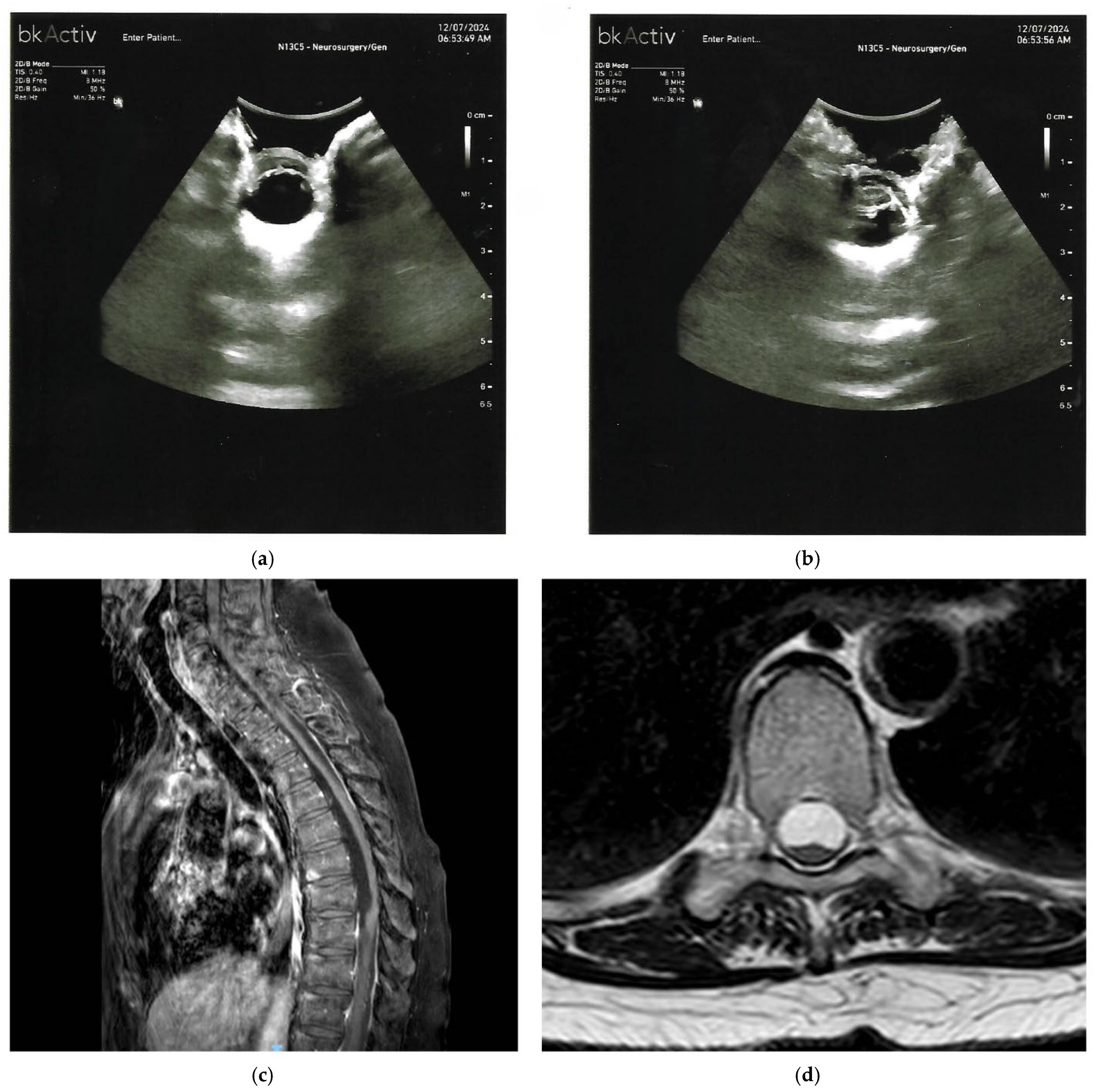 | Neuroenteric or Respiratory Cysts | Well circumscribed, cerebrospinal fluid-like signal on T2; no enhancing solid component; focal cord compression. | Anechoic or hypoechoic cavity with well-defined margins, echogenic lining, occasional septations; eccentric cord displacement. |