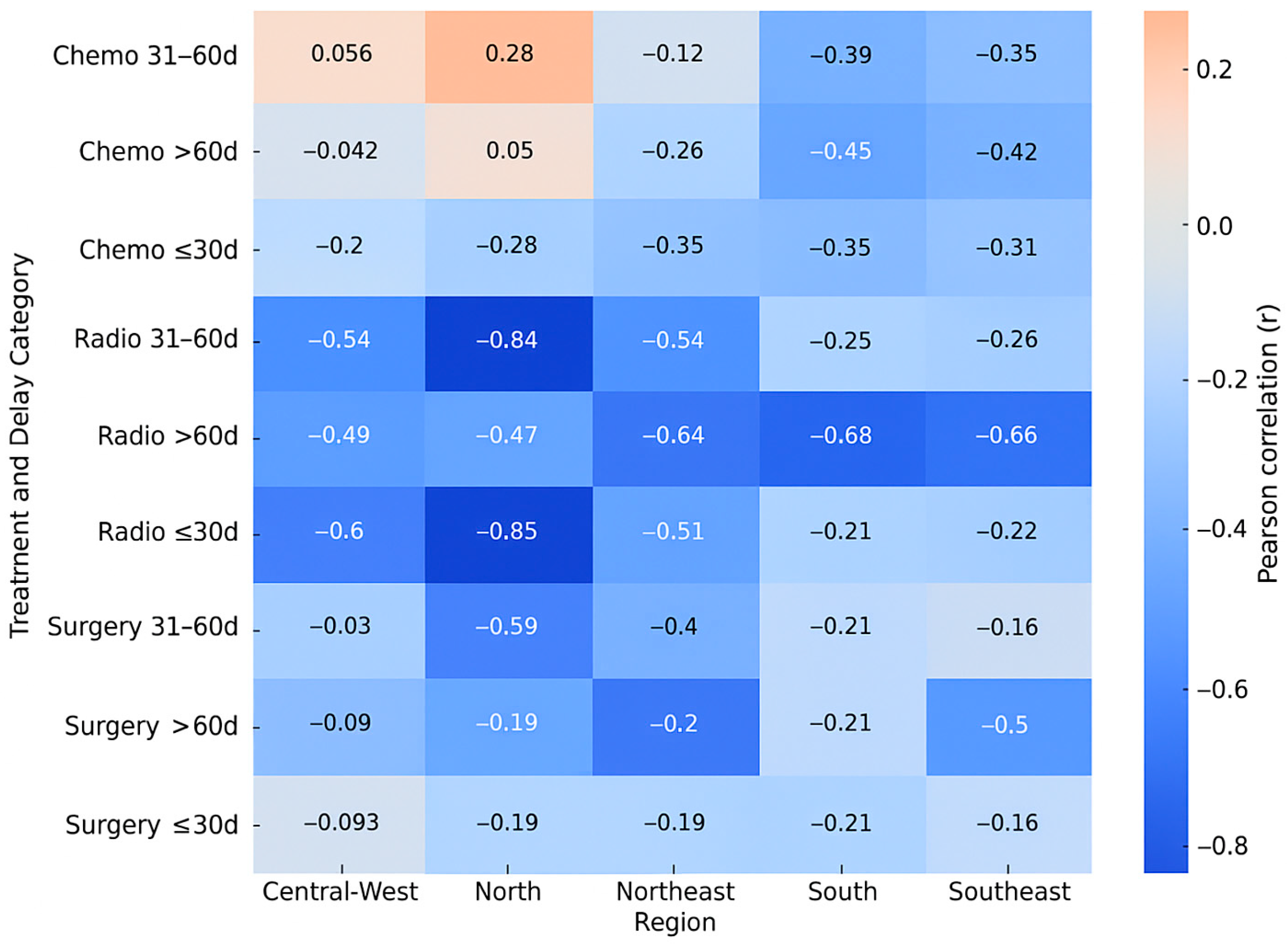 Figure 1 summarizes the Pearson correlation coefficients between treatment delay and mortality for each therapeutic modality across Brazil’s five regions. Stronger negative correlations (r < −0.6) were observed for radiotherapy in the North, Northeast, and South regions, especially when treatment was initiated after more than 60 days. Surgery exhibited moderate negative correlations in the same delay interval, whereas chemotherapy correlations were generally weaker. These results reinforce that radiotherapy and surgical treatments are more sensitive to delays in initiation, mainly in regions with lower HDI.