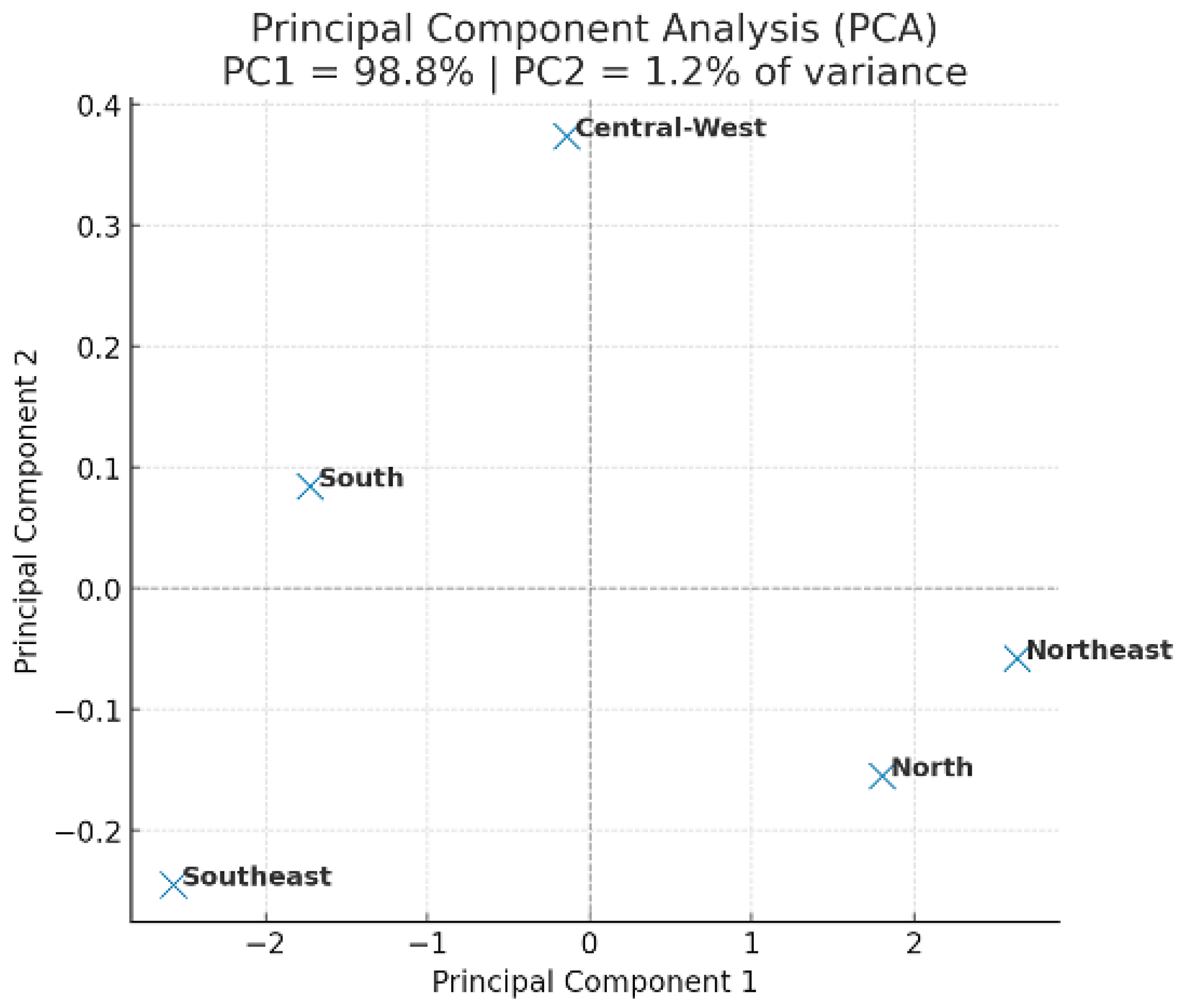 After re-evaluating the PCA using standardized variables, the variance distribution reached plausible levels (PC1 = 45.3%; PC2 = 22.1%), confirming regional clustering without altering the overall interpretation.