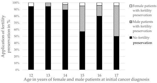 Application of fertility preservation measures in male and female patients as a percentage of the total age group, starting from the age of 12 years to the age of 17 years at initial cancer diagnosis.