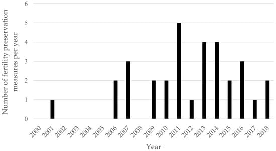 Number of fertility preservation measures from 2000 to 2018 in pediatric patients at one single center per year.
