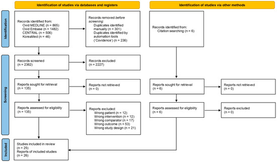 A total of 2899 records were identified from the databases, of which 537 duplicates were removed before screening. The titles and abstracts of 2362 records were screened, and 2227 records not relevant to this review were excluded. A total of 135 reports were identified through database searches, and an additional of 6 reports were found via citation searching. After reviewing the full-text, 115 reports were excluded. Ultimately, 25 cohort studies were included, corresponding to 26 reports. Two reports were from the same cohort study but with different observation periods [9,27]. The study selection process is illustrated in the PRISMA flow diagram (Figure 1).
