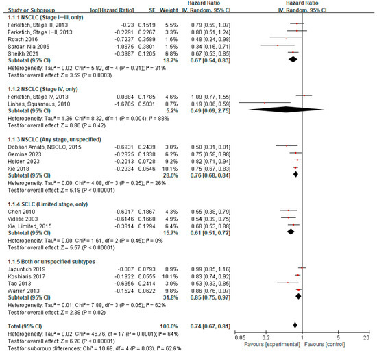 The results of our review align with the findings from previous studies. A systematic review by Parsons et al. analyzed 4 NSCLC and 2 SCLC observational studies and found that continued smoking post-diagnosis was associated with poorer disease-free and overall survival [44]. Similarly, a meta-analysis by Caini et al. of 8 NSCLC, 4 SCLC, and 6 mixed or unspecified subtype studies confirmed a significant survival benefit when smoking cessation occurred near the time of diagnosis [13]. Building upon these findings, our study further evaluated survival outcomes according to both histological subtype and clinical stage (I–III vs. IV in NSCLC; limited vs. extensive in SCLC) to identify subgroups most likely to benefit from quitting smoking at diagnosis. Notably, our findings demonstrated that the survival benefit of quitting was particularly pronounced in early-stage lung cancer, and no significant benefit was observed in advanced-stage lung cancer.