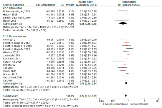 In subgroup analyses stratified by smoking cessation intervention (intervention vs. no intervention; Figure 3), the survival benefit of quitting smoking was more pronounced in studies that incorporated smoking cessation interventions. The aHRs for mortality among quitters were 0.55 (95% CI 0.35–0.88) in studies with interventions and 0.76 (95% CI 0.68–0.84) in those without interventions.