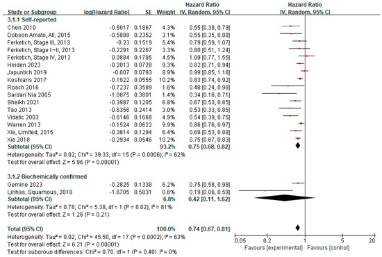 Furthermore, subgroup analyses stratified by method of smoking cessation verification (self-reported vs. biochemically confirmed; Figure 4) demonstrated the survival benefit of quitting smoking in studies with self-reported outcomes, with an aHR of 0.75 (95% CI 0.68–0.82). However, no significant difference in survival was observed between quitters and continued smokers in studies with biochemically confirmed outcomes (aHR 0.42, 95% CI 0.11–1.62).