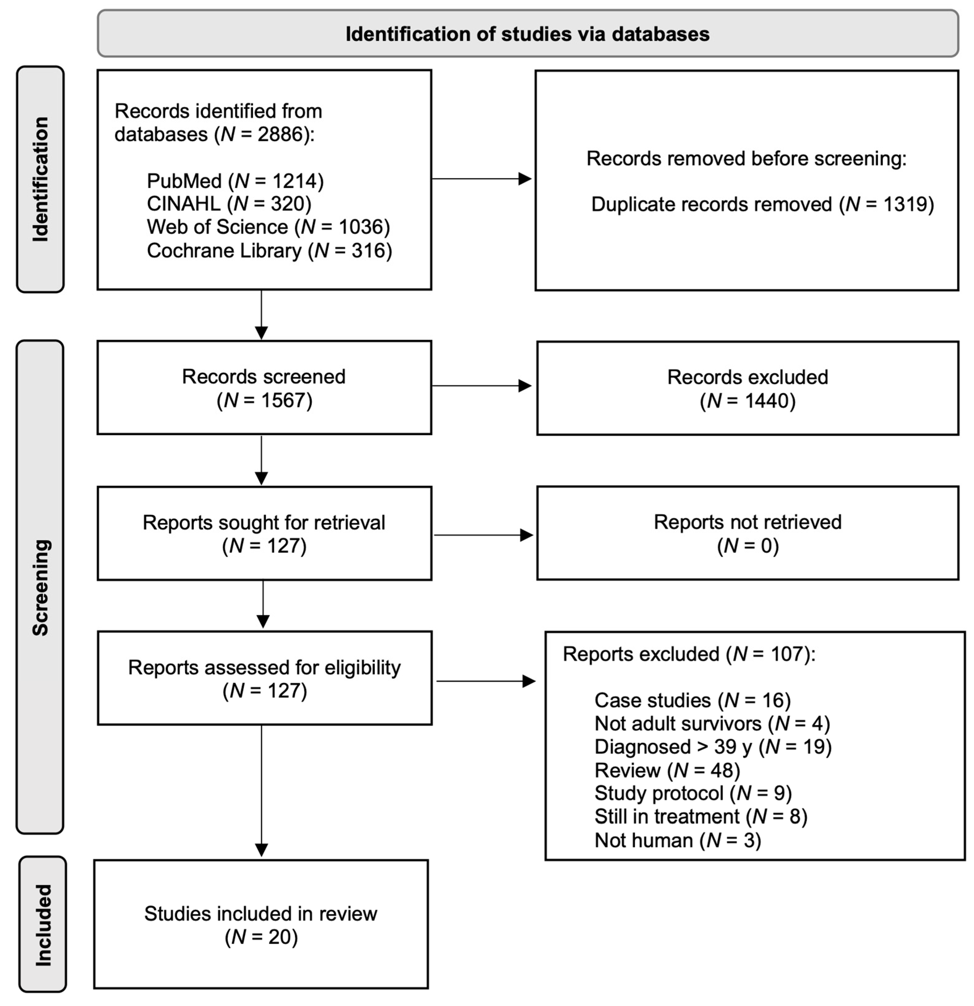 | Heemelaar et al., 2021 [32] The Netherlands | N = 75 41.3% male | 46 ± 12 17.6 (12.4–25.8) mean years from treatment | RT: 100% Chemo: 80% |