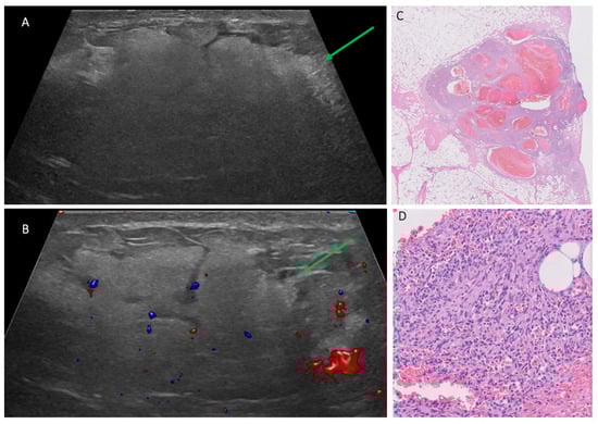 Patient 14 in Table 1 and Table 2, a 22-year-old pregnant female with a growing left breast lump. (A,B) Targeted ultrasound to the palpable area, with green arrows pointing to a 7.1 cm parallel, mixed-echogenicity irregular lesion between 1:00–3:00, 6 cm from the nipple, with obscured margins and vascular flow. Ultrasound-guided biopsy yielded high-grade angiosarcoma. (C) Histopathology with H&E stain showed a vascular proliferation. (D) High-power view revealed solid areas of spindled tumor cells with cytologic atypia and increased mitotic activity. Immunohistochemistry further confirmed vascular origin, supporting a diagnosis of high-grade angiosarcoma. AI DS = suspicious, 4A–4B.