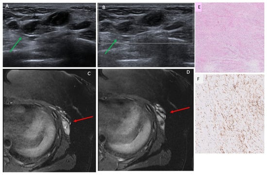 Patient 5 in Table 1 and Table 2, a 20-year-old woman with new palpable lump in the left lateral chest wall. (A,B) Ultrasound targeted to the palpable lump showed a 3.4 cm irregular hypoechoic mass located in the left lateral breast, 17 cm (green arrow), which had posterior acoustic enhancement and absence of vascular flow. Biopsy yielded fibromyxoid sarcoma. (C,D) Contrast-enhanced MRI show a corresponding lobulated, irregular mass with heterogenous enhancement, highlighted by red arrows. (E) H&E stain showing a bland spindle cell neoplasm with low-to-moderate cellularity and myxoid background. (F) Immunohistochemistry demonstrating MUC4 positivity, supporting the diagnosis of low-grade fibromyxoid sarcoma. AI DS = suspicious, 4A–4B.