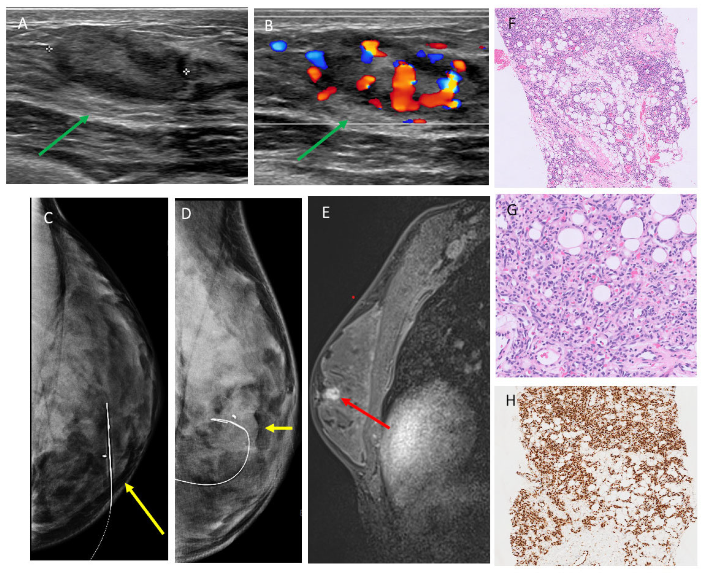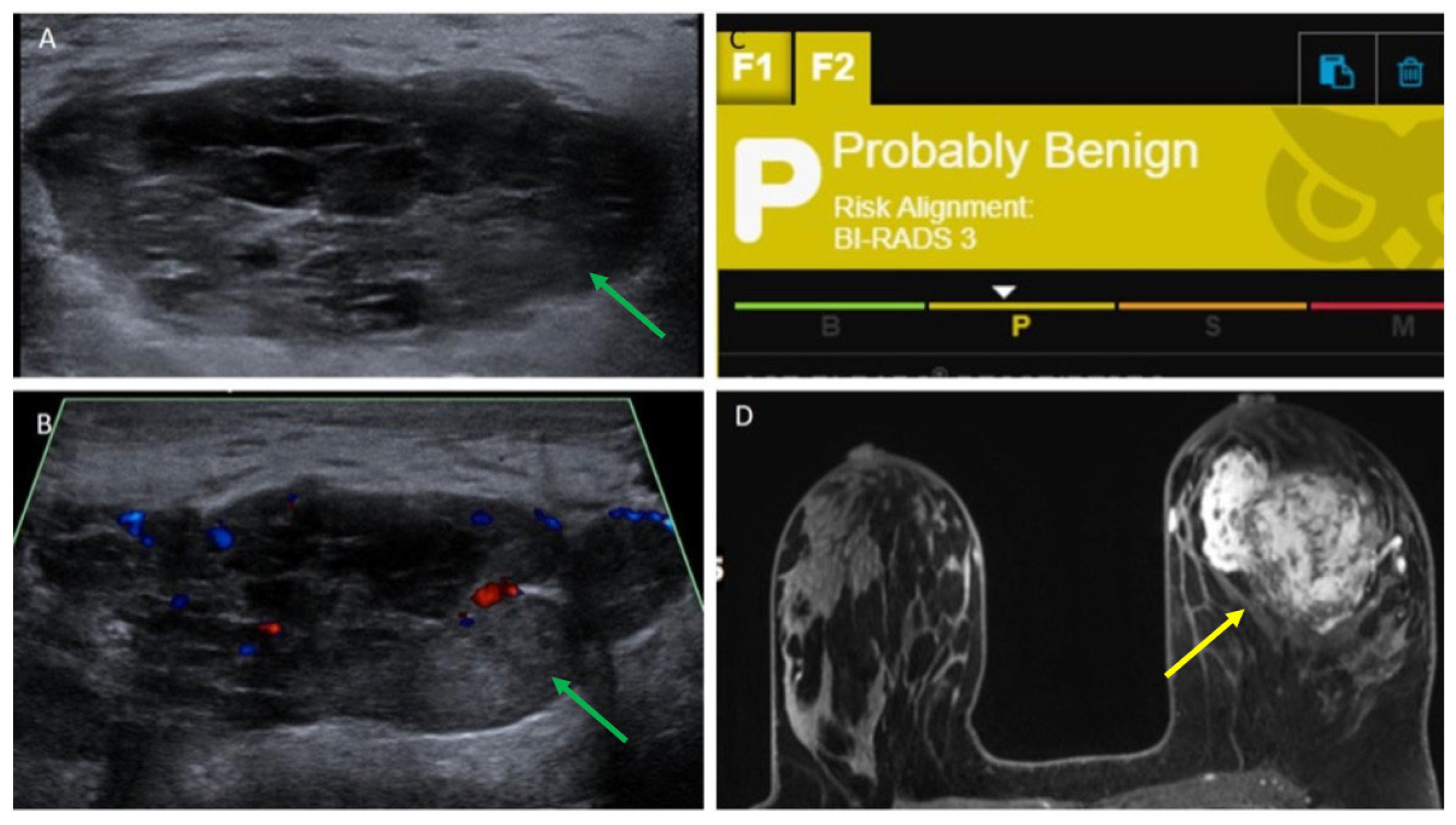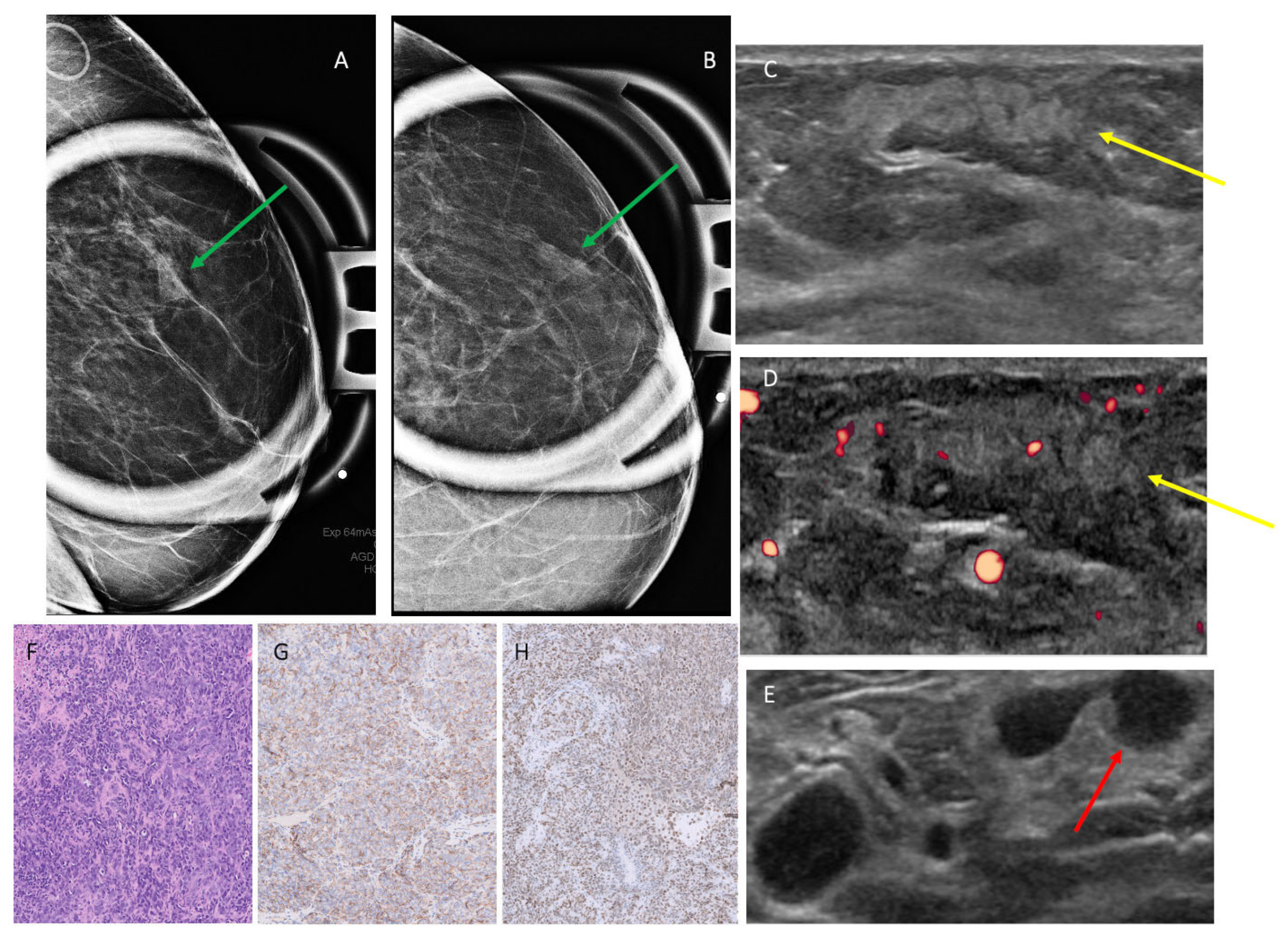 | 10 | 2.5 | Ultrasound core needle biopsy | Irregular high-density mass with indistinct margins | Irregular, parallel, heterogeneous mass with indistinct margins, posterior acoustic enhancement and Doppler flow | Suspicious, 4A–4B | Irregular mass with irregular margins and heterogeneous enhancement |