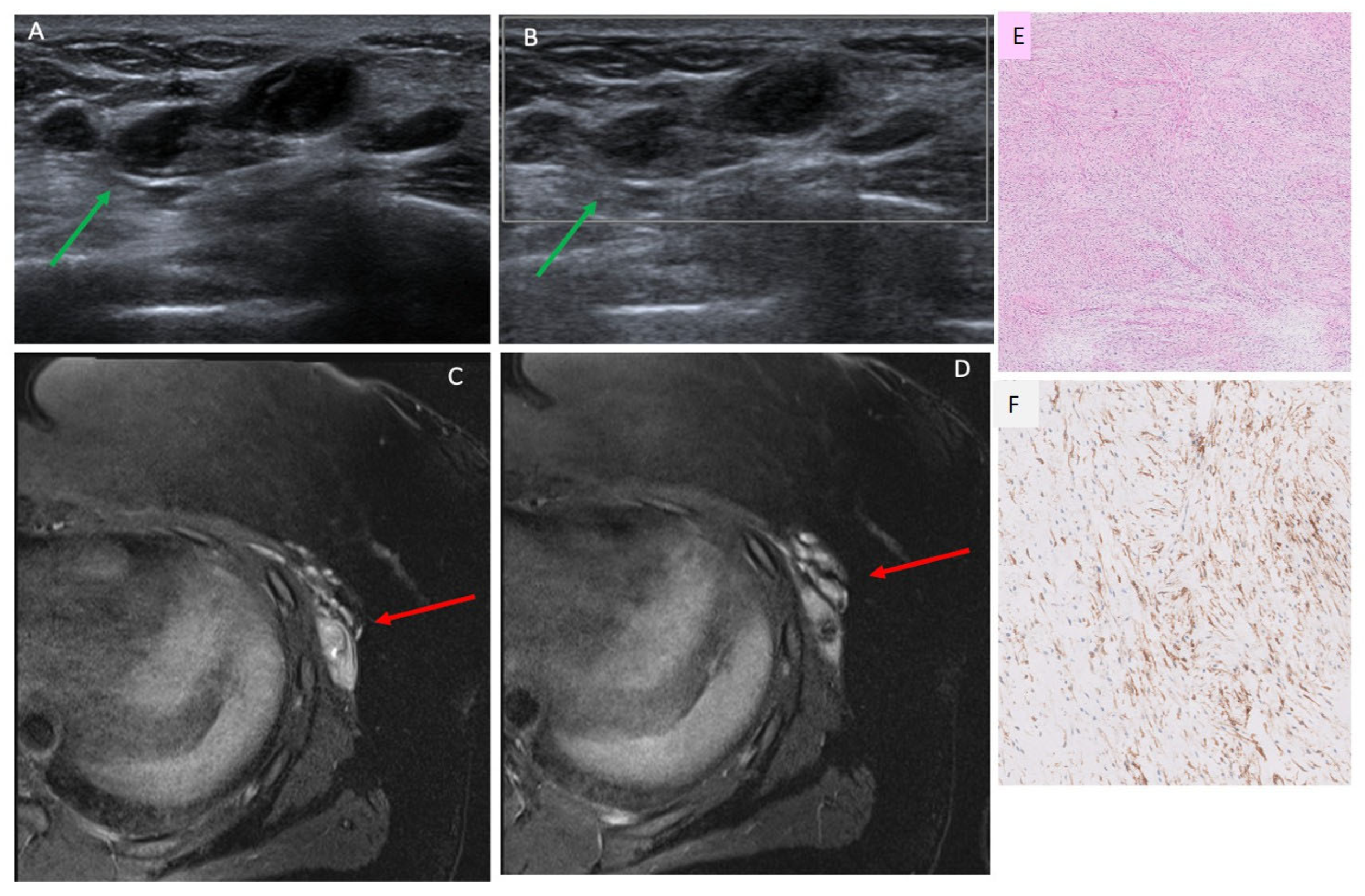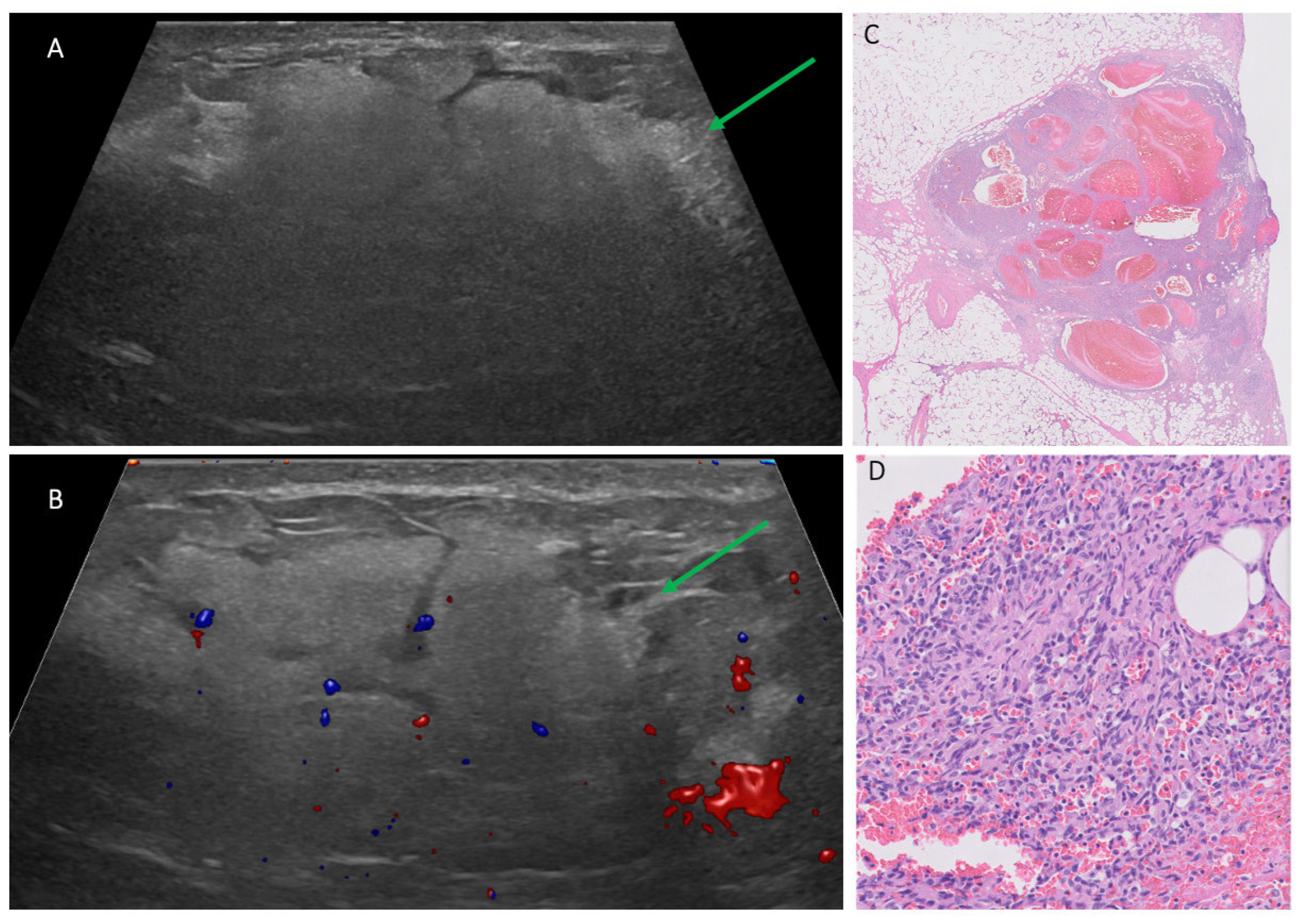 | 7 | 2.7 | Skin punch biopsy | N/a | Irregular, parallel, hypoechoic mass with microlobulated margins, posterior acoustic enhancement and Doppler flow | Suspicious, 4A–4B | N/a |
