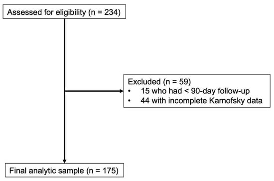 A total of 234 adult patients operated on for MSD between April 2012 and April 2025 were assessed for eligibility. Inclusion criteria included patients with (1) complete preoperative KPS and ECOG-PS score data and (2) at least 90-day follow-up (or less if they had documented death). Our study selection algorithm is depicted in Figure 1. Based on this, a total of 175 patients were included in our final analytic sample.