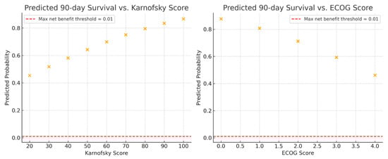 Calibration (assessing how well predicted probabilities reflect actual outcomes) was modest, with Brier scores of 0.185 for KPS and 0.182 for ECOG-PS. These scores are comparable to those reported in other oncologic prognostic models [,], suggesting that while predictions were not perfectly aligned with observed outcomes, they were directionally reasonable. However, perfect calibration is rare, particularly in models that include only a single predictor [].