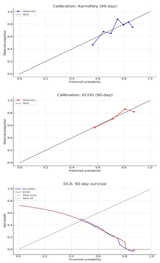 Calibration plots for both scores demonstrated reasonable agreement between predicted and observed 90-day survival across deciles. Brier scores were 0.185 for KPS and 0.182 for ECOG-PS, indicating modest but comparable overall calibration performance (Figure 5).