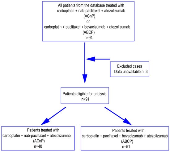 Within the established treatment landscape for advanced NSCLC, the IMpower150 regimen (atezolizumab, bevacizumab, carboplatin, and paclitaxel; ABCP) and the IMpower130 regimen (atezolizumab, carboplatin, and nab-paclitaxel; ACnP) have demonstrated considerable efficacy, particularly in defined patient subgroups [,]. These regimens provide viable alternatives for patients with contraindications to pemetrexed-based chemotherapy, such as those with renal dysfunction or resistance to epidermal growth factor receptor tyrosine kinase inhibitors (EGFR-TKIs) [,]. However, despite their shared clinical utility, direct real-world comparative analyses of their efficacy and safety profiles are lacking.