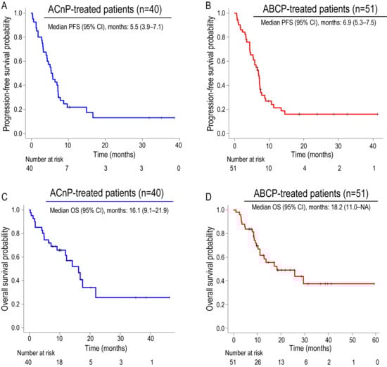 Kaplan–Meier survival curves for PFS and OS are shown in Figure 2. The median PFS was 5.5 months (95% CI, 4.0–7.1) in the ACnP group and 6.9 months (95% CI, 5.3–7.5) in the ABCP group (Figure 2A,B). Median OS was 16.1 months (95% CI, 9.1–21.9) for the ACnP group and 18.3 months (95% CI, 11.0–not available) for the ABCP group (Figure 2C,D). These findings demonstrate a survival advantage with the ABCP regimen compared with ACnP.