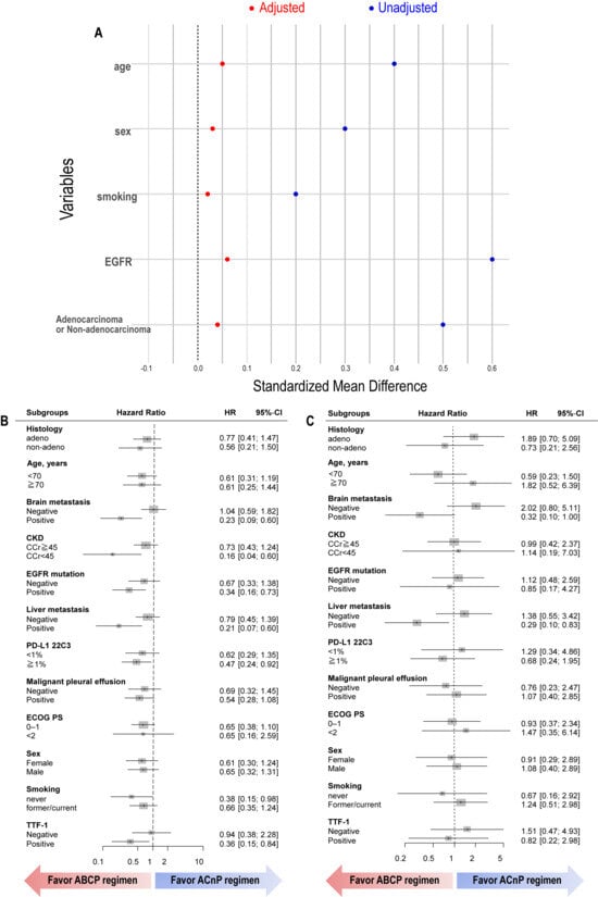 Subgroup analysis of progression-free survival and overall survival adjusted by inverse probability of treatment weighting (IPTW). (A), Standardized mean difference (SMD) plots before and after IPTW adjustment. (B), Progression-free survival. (C), Overall survival. ACnP, carboplatin plus nab-paclitaxel plus atezolizumab regimen; ABCP, carboplatin plus paclitaxel plus bevacizumab and atezolizumab regimen; CKD, chronic kidney disease; ECOG PS, Eastern Cooperative Oncology Group performance status; TTF-1, thyroid transcription factor-1.
