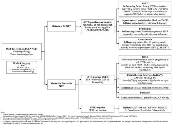 With the expanding arsenal of systemic therapies, optimal sequencing in NETs has become a critical consideration. Therapeutic sequencing should be individualized, considering tumor biology parameters, such as grading, differentiation status, proliferation indices, and somatostatin receptor (SSTR) expression, as well as patient comorbidities and prior treatment history, see Figure 1. For instance, in a metastatic well-differentiated midgut NET that exhibits high SSTR expression and is classified as low-grade, an appropriate initial approach might involve the use of SSAs to achieve disease stabilization and symptom control if indicated. Upon disease progression, peptide receptor radionuclide therapy (PRRT) can be considered earlier in the treatment course, especially given emerging evidence from the COMPETE trial supporting its use at this stage [], with drugs such as everolimus being reserved for later lines of therapy.