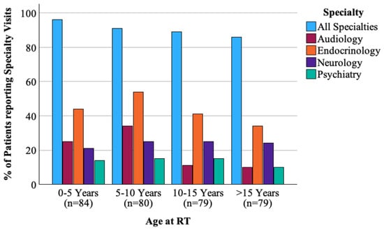 Proportion of patients reporting specialty visits in the past year by age at time of radiation.