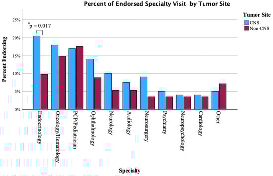The health issues reported among irradiated survivors varied according to where the tumor arose, in the CNS or outside of the CNS. Patients with CNS tumors reported greater difficulties with endocrine deficiencies, balance difficulties, and weight problems, which is consistent with the literature [,,,,,,,,,]. Craniospinal irradiation for CNS malignancies may cause direct, dose-dependent, radiation injury to the hypothalamic–pituitary axis and adjacent structures including the cerebellum, brainstem, and thyroid gland due to the dose localization of the radiation therapy. The hypothalamic–pituitary region, as an important regulator of gonadotropins and the growth, adrenocorticotropic, and thyroid hormones, contributes to abnormalities in these endocrine function indicators when disrupted. Accordingly, in our study, CNS-treated patients reported significantly higher endocrinology visits in the past year in comparison to non-CNS-treated patients. Though dose received was not a point of focus for the current analysis, future applications of the survey may be used in conjunction with available patient data (such as cumulative dose received to relevant structures) to further investigate the differences to self-reported endocrine sequelae [,,]. Additional context including chemotherapeutic dosing may also help explain differences in endocrine sequelae between patients. Endocrine disruptions are seen with chemotherapeutics for oncological tumor control including gonadal failure with alkylating agent use and thyroid dysfunction with tyrosine kinase inhibitors []. Hypothalamic control of satiety and fatigue-related pathways, in addition, complicates concerns of weight in conjunction with the growth hormone disruption [,]. Balance abnormalities, similarly, may occur due to radiation-related injury or disruption to associated structures. In CNS-directed radiation, therapy would be more likely to target balance/stability mediated by cerebellar areas, vestibular pathways, and the brainstem. Beyond radiation, diagnosis-related surgical interventions and history of related concerns (i.e., hydrocephalus) may also be contributory []. The reported “medical specialists seen” also reflected differences by site of disease. Such information can help us target specific questions in the future to patients to ascertain key information without burdening the patient or parent proxy reporter.